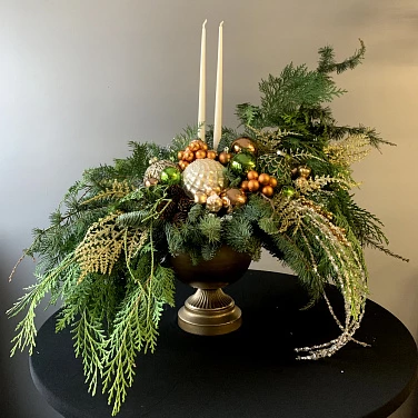 Мастера флористы добавляют не только традиционные элементы, но и уникальные акценты, такие как яркие ягодки и стеклянные шарики, отражающие свет в любом углу комнаты. Ваша новогодняя композиция станет не только центральным элементом стола, но и настоящим произведением искусства, которое будет радовать глаз и напоминать о самых тёплых моментах праздника.